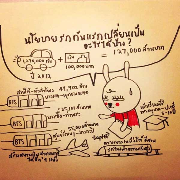 ข่าวนโยบายรถคันแรกตอนนี้ทะลุ 910,000 คัน สถิติอยู่ที่ 30,000 คันต่อวัน ดังนั้นนั้นครบกำหนดสิ้นปีนี้จะมีรถเข้าโครงการ 1,270,000 คัน คันละ 100,000 บาท เป็นเงินที่รัฐควรจะได้ 127,000 ล้านบาท ..เขาก็วาดให้ดูว่าทำอะไรให้ประเทศคุณได้บ้าง