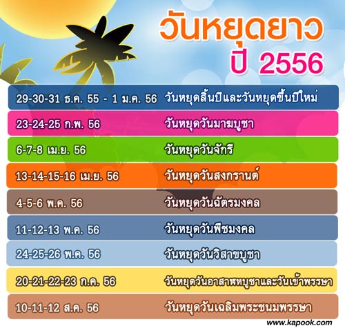 หลังจากผ่านปีเก่าเข้าสู่ปีใหม่ พ.ศ. 2556 ปฏิทินวันหยุดของปีนี้ ก็ทยอยมีออกมาให้เห็นกันตั้งแต่ต้นปี ซึ่งข้อมูลของปฏิทินวันหยุด 2556 พบว่า มีวันหยุดยาวถึง 9 ครั้ง ดังนี้