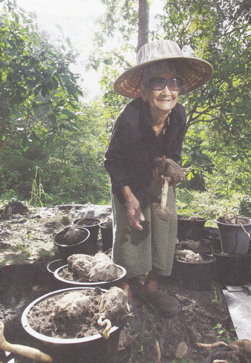 "ชีวิตเกิดมาต้องให้บ้างหนา อย่าเอาแต่รับนะลูก" ยายยิ้ม บอกอย่างนี้ จึงไม่แปลกใจเลยว่า นอกจาก ยายยิ้ม จะ "ให้" กับธรรมชาติแล้ว ยายยังหมั่นทำบุญสุนทานเสมอ ทุกวันพระ ยายยิ้มจะตื่นแต่เช้าตรู่ลุกขึ้นมาหุงข้าว และทำกับข้าวง่าย ๆ ก่อนจะเดินฝ่าดงหินแหลมคมออกมาจากป่าเป็นระยะทางกว่า 8 กิโลเมตร เพื่อมาทำบุญ แล้วจะขออาศัยนอนที่วัดเพื่อถือศีลอุโบสถ 1 คืน ก่อนจะเดินทางกลับกระท่อมในวันรุ่งขึ้น ยายยิ้มทำเช่นนี้มาเป็นเวลากว่า 20 ปี แม้ฝนจะตก แดดจะออก ก็ไม่มีอุปสรรคใดจะมาขวางไม่ให้ยายยิ้มออกมาทำบุญที่วัดได้เลย แต่หากวันพระใดไม่เห็นยายยิ้ม ชาวบ้านจะรู้กันว่าต้องขึ้นไปเยี่ยมแกบนเขา เพราะเคยเจอเหตุการณ์ที่ยายยิ้มนอนป่วยด้วยโรคชราอยู่ จึงต้องรีบพาตัวยายลงมาให้หมอรักษา