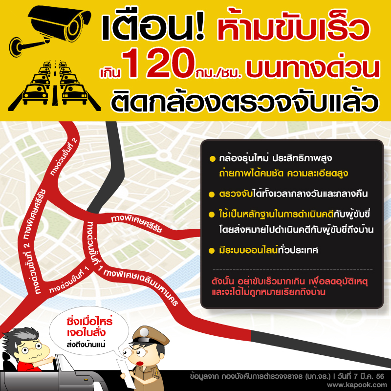 วันนี้ (7 มีนาคม) ผู้สื่อข่าวรายงานข่าวจากกองบังคับการตำรวจจราจร (บก.จร.) แจ้งว่า ตามที่การทางพิเศษแห่งประเทศไทย (กทพ.) มีโครงการติดตั้งกล้องตรวจจับความเร็วบนทางด่วนขั้นที่ 1 และทางด่วนขั้นที่ 2 โดยได้ติดตั้งเสร็จเรียบร้อยตั้งแต่ต้นปี 2556 และทำการทดสอบระบบเป็นที่เรียบร้อยแล้วนั้น เมื่อวันที่ 4 มีนาคมที่ผ่านมา พล.ต.ต.วรศักดิ์ นพสิทธิพร รองผู้บัญชาการตำรวจนครบาล (บช.น.) รับผิดชอบงานจราจร ได้สั่งการให้ตำรวจ สน.ทางด่วน 1 และ สน.ทางด่วน 2 เริ่มดำเนินคดีกับผู้ที่ขับขี่รถเร็วเกินกว่าที่กฎหมายกำหนด จากกล้องตรวจจับความเร็วที่ กทพ. ได้ทำการติดตั้งไว้ตามจุดต่าง ๆ