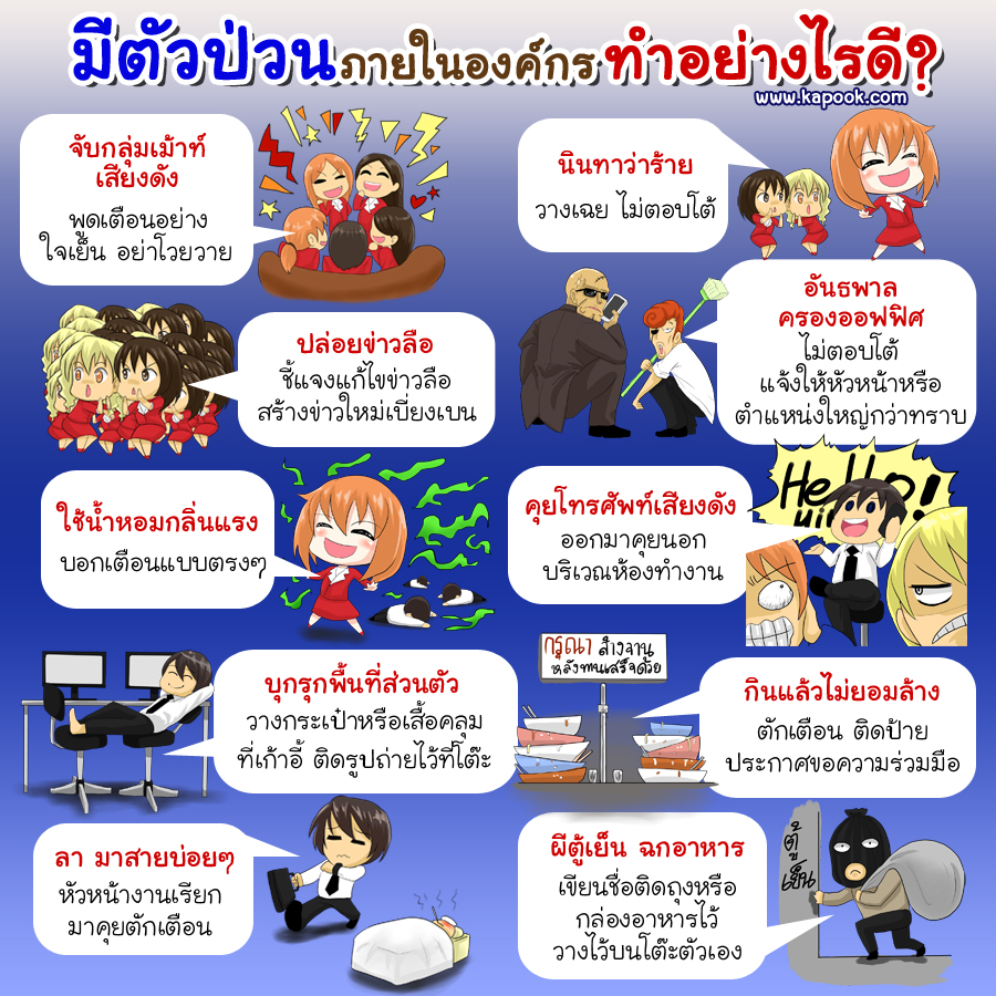 ไม่ว่าจะคุยโทรศัพท์กับลูกค้า หรือคุยโทรศัพท์เรื่องส่วนตัว แต่รู้กันไปทั่วห้องแบบนี้ แล้วเพื่อนร่วมงานจะมีสมาธิทำงานไหมล่ะนั่น แต่รู้ไหมคะว่าคนบางคนจะติดนิสัยพูดเสียงดังเป็นธรรมชาติอยู่แล้ว แถมเจ้าตัวอาจไม่รู้ตัวด้วยซ้ำ เพราะฉะนั้นแล้ว ควรให้คนที่สนิทสนมกับเขาไปบอกให้เขารู้ตัวหน่อยนะว่า ตัวเขาเป็นคนพูดเสียงดังนะ เพื่อให้เขารู้ตัวและปรับพฤติกรรมของตัวเองให้พูดเบาลง เพราะการพูดเสียงดังนอกจากจะรบกวนคนอื่นแล้ว ยังทำให้ดูเสียบุคลิกด้วย แต่ถ้าเขาปรับการพูดไม่ได้จริง ๆ ก็แนะนำไปว่า ถ้ามีธุระส่วนตัวต้องคุยก็ขอให้ปลีกตัวออกมาคุยนอกบริเวณห้องทำงานจะดีกว่า จะได้ไม่รบกวนคนอื่นเขาไง
