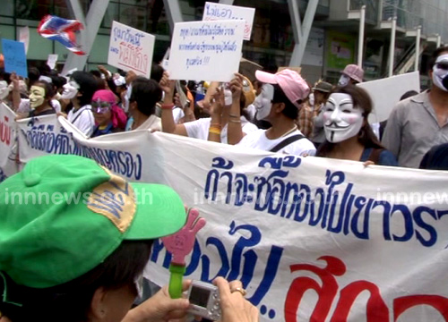 เมื่อช่วงบ่ายวันนี้ (21 กรกฎาคม 2556) ที่ลานหน้าห้างสรรพสินค้า เซ็นทรัล เวิลด์ กลุ่มผู้ชุมนุมหน้ากากขาว ทยอยเดินทางมาชุมนุมบริเวณดังกล่าวอย่างต่อเนื่องแล้ว เพื่อร่วมกันทำกิจกรรมแสดงความไม่เห็นด้วยต่อการบริหารประเทศของรัฐบาล โดยเฉพาะนางสาวยิ่งลักษณ์ ชินวัตร นายกรัฐมนตรีและรัฐมนตรีว่าการกระทรวงกลาโหม ซึ่งกลุ่มผู้ชุมนุมได้นำป้ายข้อความ เขียนโจมตีนโยบายต่าง ๆ ของรัฐบาล พร้อมส่งเสียงขับไล่รัฐบาลอยู่เป็นระยะ