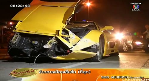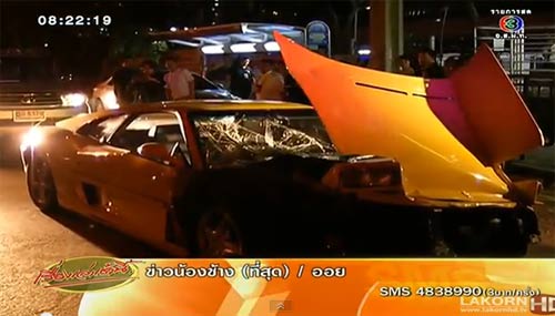 เมื่อเวลา 01.00 น. ของวันนี้ (30 ตุลาคม 2556) ผู้สื่อข่าวรายงานว่า เกิดเหตุรถยนต์เฟอร์รารี่ F 355 สีเหลือง ทะเบียน ฐน 355 กทม. พุ่งชนท้ายรถเก๋งฮอนด้า ซิตี้ สีขาว ทะเบียน กน 7747 นครสวรรค์ บริเวณเชิงสะพานภูมิพล 1 ทำให้มีผู้ได้รับบาดเจ็บ 3 คน ซึ่งเจ้าหน้าที่ได้นำตัวส่งโรงพยาบาลบำรุงราษฎร์