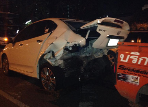 โชว์แรง ! รถเฟอร์รารี่ 2 คัน ซิ่งแข่งขัน ก่อนรถคันที่ขึ้นนำหักหลบกะทันหัน ทำให้เฟอร์รารี่อีกคัน ขับโดย เอกภัทร พรประภา ทายาท เอ.พี. ฮอนด้า ที่ขับตามมาหลบไม่ทัน พุ่งเสยเก๋งฮอนด้า ซิตี้ เข้าอย่างจัง เจ็บ 3