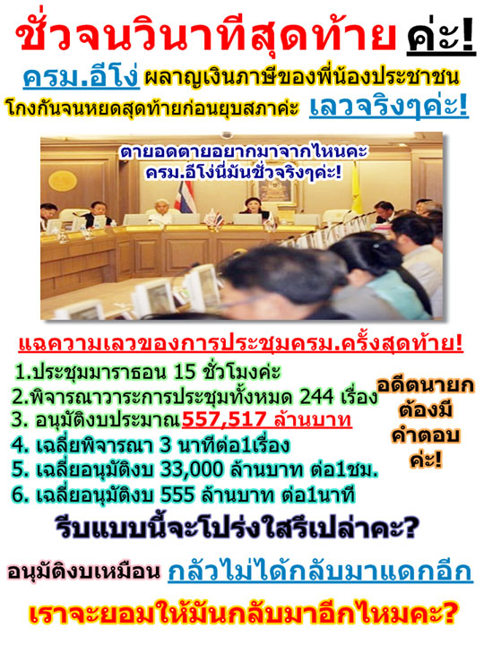 วันนี้ (10 ธันวาคม 2556) มีรายงานว่า ได้มีชาวเน็ตโพสต์ภาพรัฐบาล ยิ่งลักษณ์ ชินวัตร พร้อมระบุว่า เป็นการประชุม ครม.ครั้งสุดท้าย ยาวกว่า 15 ชั่วโมง โกงกันจนหยดสุดท้ายก่อนยุบสภา พิจารณาวาระการประชุมทั้งหมด 244 เรื่อง อนุมัติงบประมาณ 557,517 ล้านบาท เฉลี่ยพิจารณา 3 นาที ต่อ 1 เรื่อง เฉลี่ยอนุมัติงบ 33,000 ล้านบาท ต่อ 1 ชม. เฉลี่ยอนุมัติงบ 555 ล้านบาท ต่อ 1 นาที รีบแบบนี้จะโปร่งใสรึเปล่า