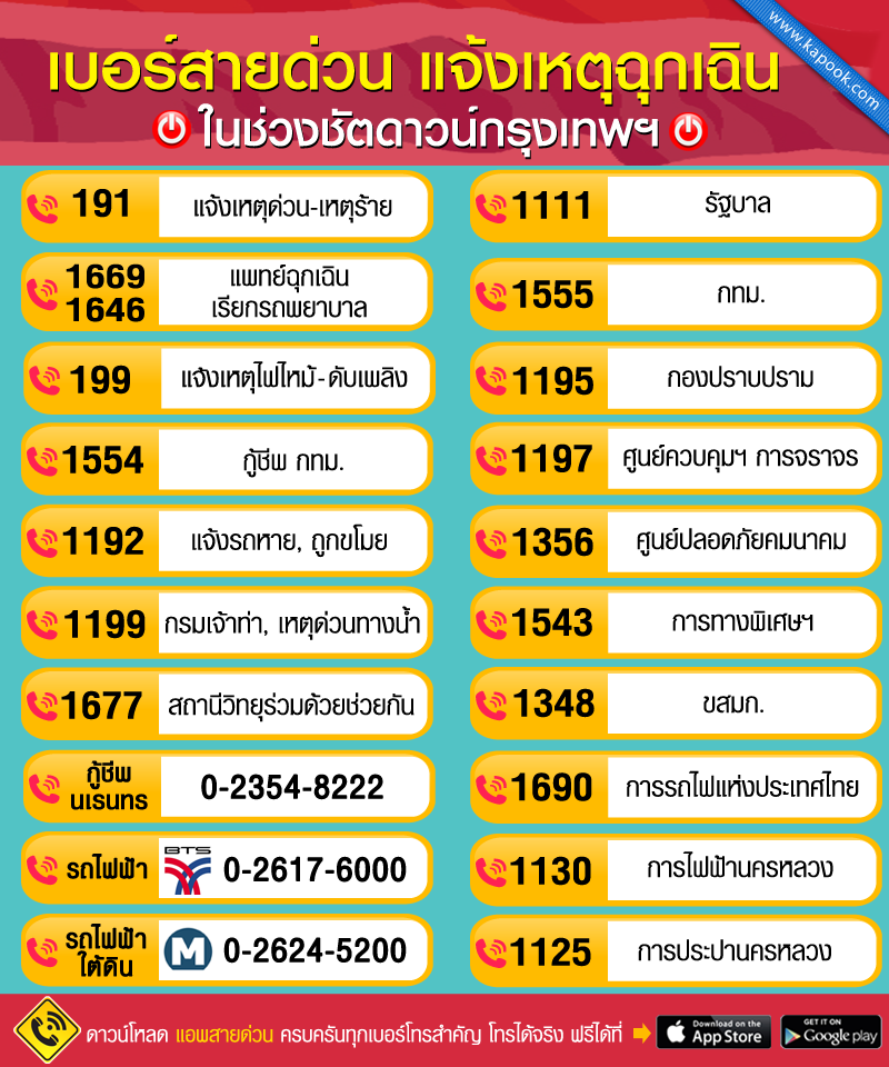 เพื่อเป็นการเตรียมพร้อมรับมือกับสถานการณ์ฉุกเฉิน หรือเหตุด่วน เหตุร้าย ที่อาจเกิดขึ้นในช่วงระหว่างมีการชุมนุม ดังนั้น ทีมงานกระปุกดอทคอม จึงรวบรวมเบอร์สายด่วนของหน่วยงานสำคัญมาฝากกัน ดังนี้