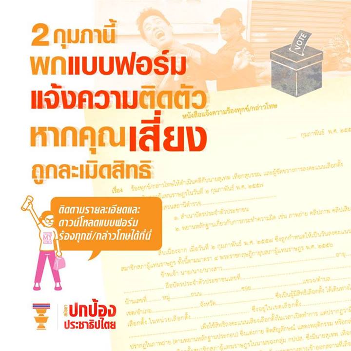 แจ้งความนายสุเทพ เทือกสุบรรณ และผู้ขัดขวางการลงคะแนนเลือกตั้ง >>> http://goo.gl/1RHBwiร่วมกัน SHARE ข้อความนี้ออกไป หากท่านอยู่ในพื้นที่เสี่ยงที่อาจเกิดการพยายามขัดขวางการลงคะแนนเลือกตั้ง พกแบบฟอร์มแจ้งความติดตัว พร้อมดำเนินการหากถูกละเมิดสิทธิในวันเลือกตั้ง 2 กุมภาพันธ์นี้ได้ทันที !