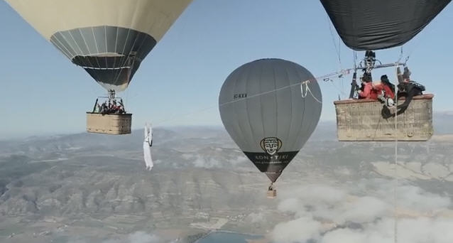 หวาดเสียวสุด ๆ 2 นักไต่เชือกท้ามฤตยูจากทีมสกายไลเนอร์ โชว์ไต่เชือกลางอากาศระหว่างบอลลูน บนความสูงกว่า 300 เมตร พลาดทีมีร่วง