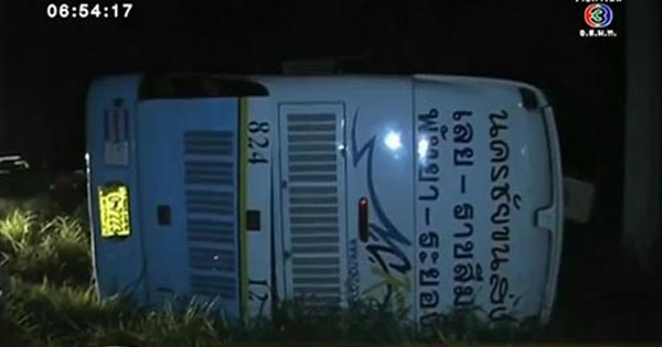 รถทัวร์ 2 ชั้น เลย-โคราช-ระยอง คว่ำที่สระบุรี คาดฝนตกถนนลื่น เจ็บ 38 ราย