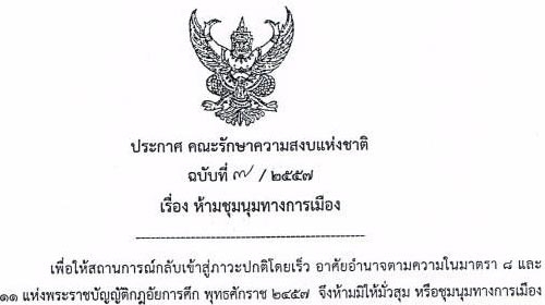 คสช. ประกาศฉบับ 7 ห้ามชุมนุมทางการเมืองตั้งแต่ 5 คนขึ้นไป