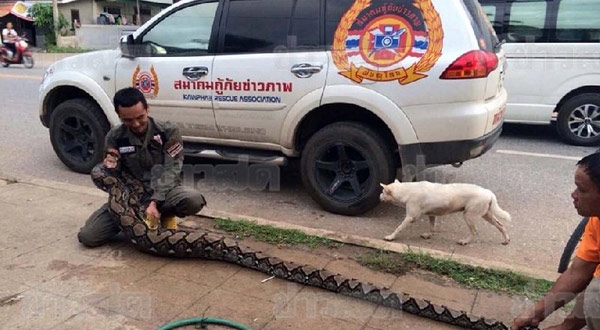 กู้ภัยต้องขอกำลังเสริม จับงูเหลือมยักษ์เขมือบสุนัขแม่ค้า