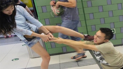 สาวจีนจอมพลังลากแฟนหนุ่มติดสมาร์ทโฟนกลางสถานีรถไฟ