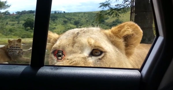 เกือบไปแล้ว สิงโตเปิดประตูรถนักท่องเที่ยวขณะชมซาฟารีปาร์ค