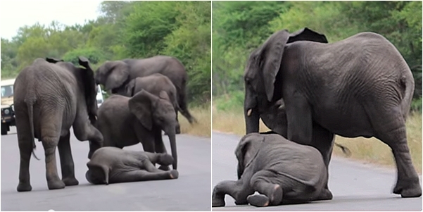 เมื่อลูกช้างตัวหนึ่งเกิดเป็นลมล้มตึงกลางถนน มาดูซิว่าช้างในโขลงจะทำยังไง