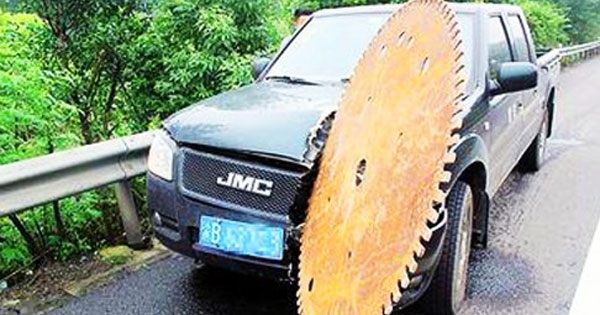 เกือบชะตาขาด หนุ่มรอดหวุดหวิดหลังใบมีดยักษ์กลิ้งผ่าเข้ากลางรถ