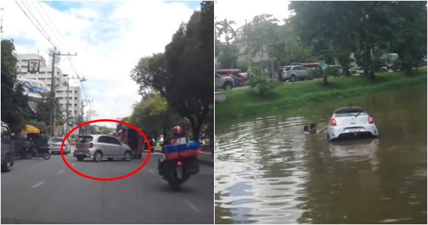 เปิดคลิประทึก รถเก๋งพุ่งตกคูเมืองเชียงใหม่ พลเมืองดีโดดลงไปช่วย