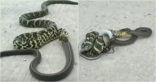 ชมกันชัด ๆ คลิปงูกินกันเอง ค่อย ๆ เขมือบเหยื่อตัวยาวกว่าเข้าไปในท้อง