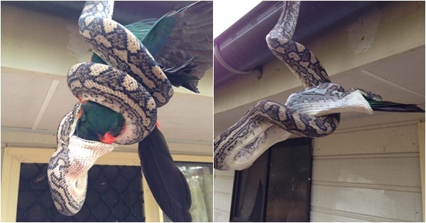 ผงะ ! หญิงพบฉากสุดสะพรึงต่อหน้า งูหลามห้อยหัวเขมือบนกแก้วทั้งตัว