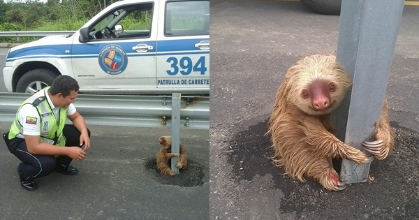 ตำรวจช่วยสลอธน้อยหลงทาง นั่งจุ้มปุ๊กเกาะเสากลางถนน แต่ยังยิ้มได้นะฮับ