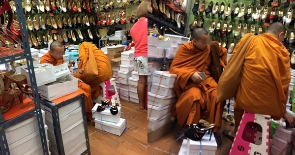 คุณพระ ! หลวงพี่ 2 รูปโผล่กลางดงร้านรองเท้าผู้หญิง นั่งลองส้นสูง