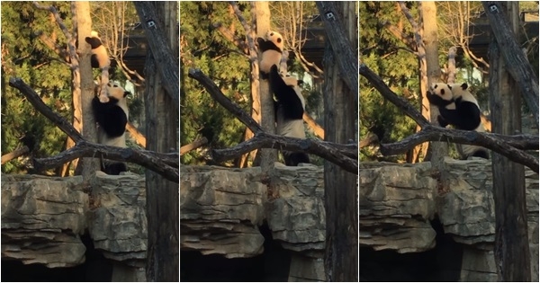 น่ารักจัง แม่แพนด้าคอยประคองลูกน้อย หัดปีนต้นไม้เป็นครั้งแรก