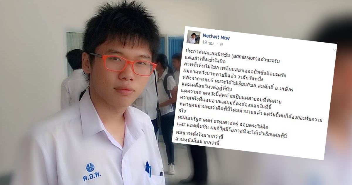 เนติวิทย์ โชติภัทร์ไพศาล อายสอบไม่ติด มธ. ฝันสลายอดเป็นศิษย์ สมศักดิ์ เจียม