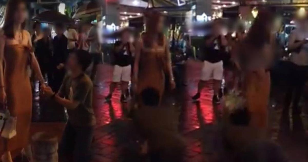 จบไม่สวย ! หนุ่มคุกเข่าขอคืนดีแฟนเก่า แต่ดันดึงชุดเธอหลุดโชว์อกล่อนจ้อน