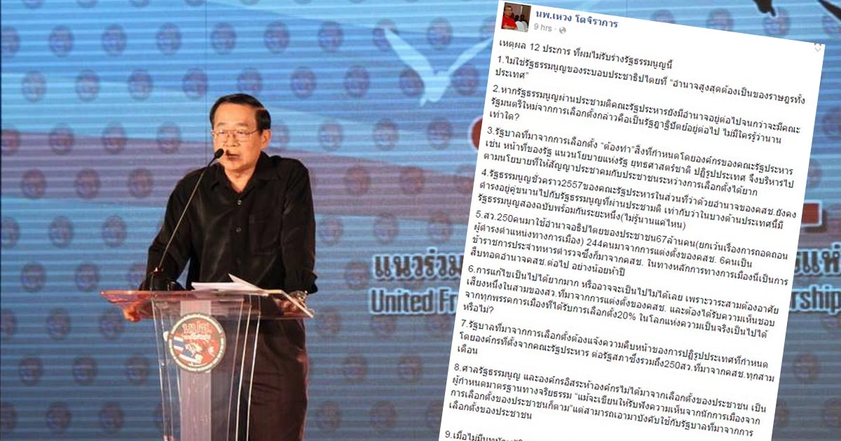 หมอเหวง เผย 12 เหตุผล ไม่รับร่างรัฐธรรมนูญ