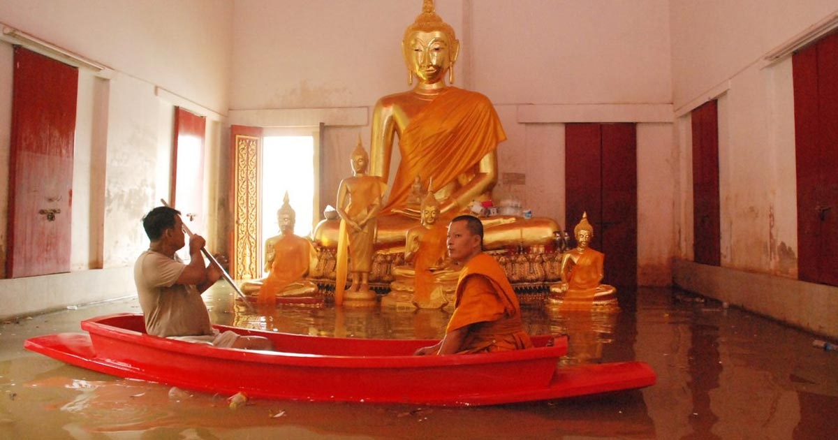 น้ำท่วมอยุธยาวิกฤตหนัก ไหลท่วมพระประธานเสียหาย พระต้องพายเรือเข้าโบสถ์