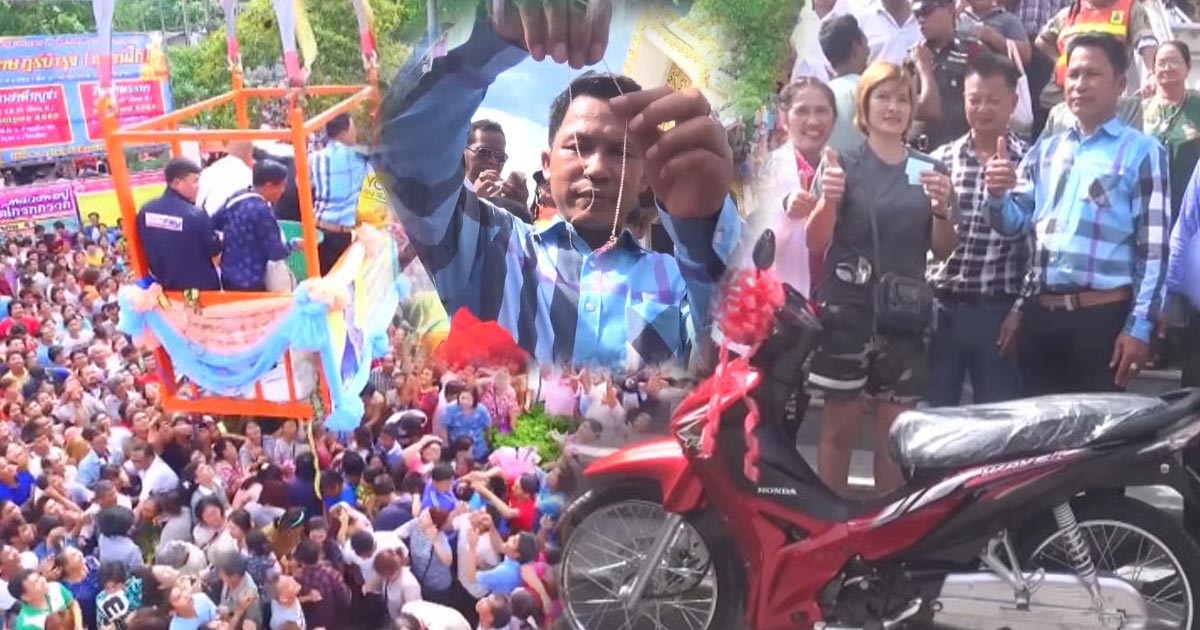 ใหญ่จริง ! งานบวชหลานชายนักธุรกิจอสังหาฯ ขึ้นรถเครนโปรยทานกว่า 3 แสน !!