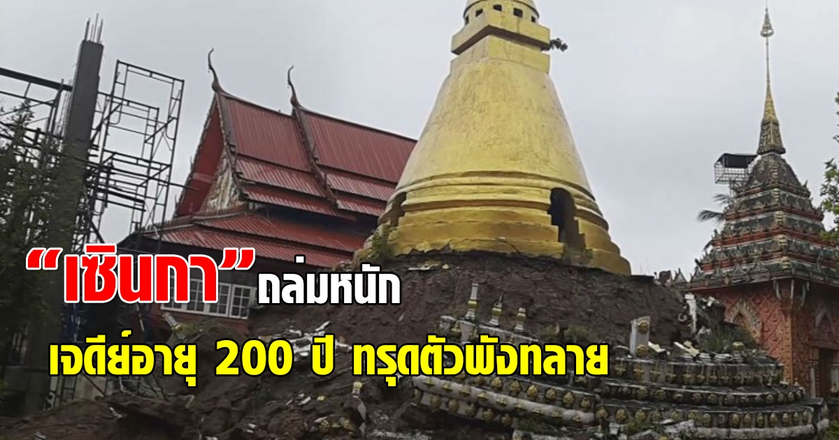 เจดีย์อายุ 200 ปี ทรุดตัวพังทลาย เหตุพายุเซินกาซัดกระหน่ำหลายวัน