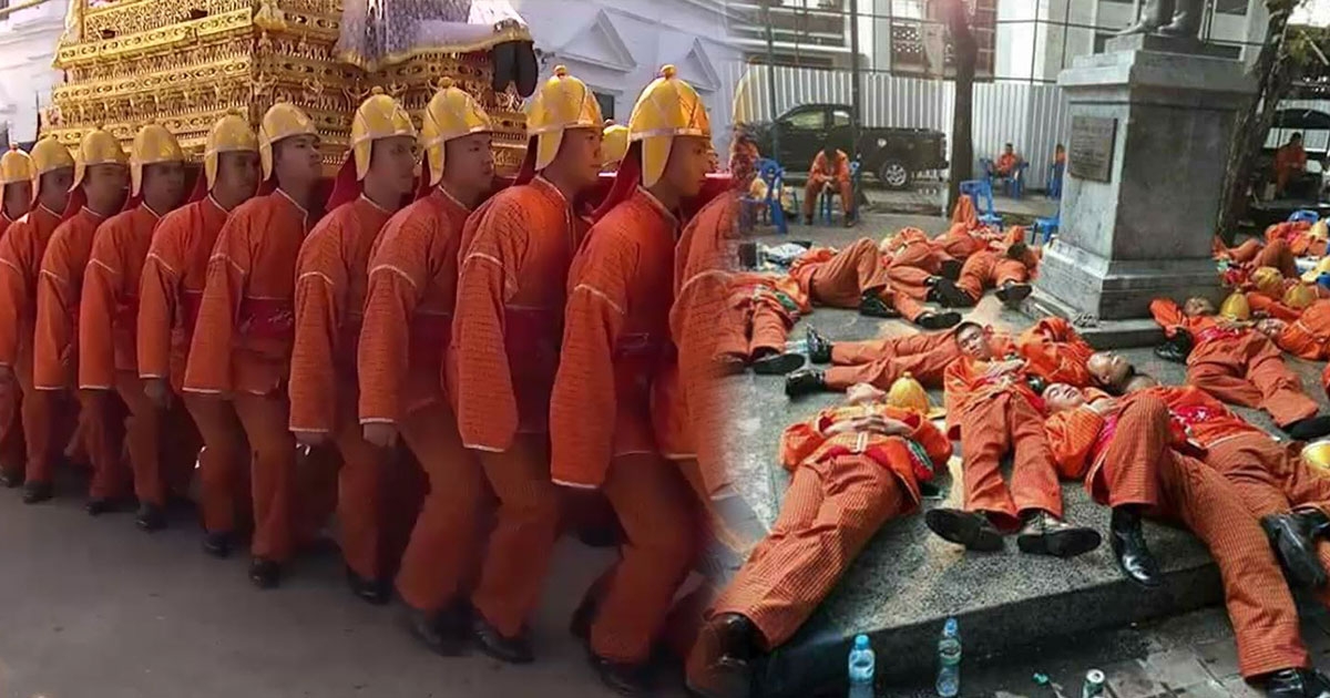 เบื้องหลัง พลแบกหาม นอนหลับบนพื้น หลังทำหน้าที่ยิ่งใหญ่ แบกพระบรมโกศไว้บนบ่า