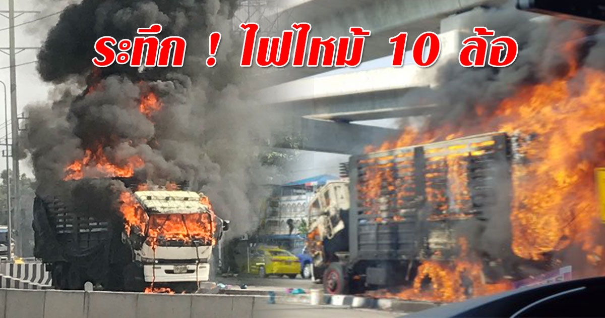 ระทึก ! ไฟไหม้ 10 ล้อ ปิดการจราจร ถ.กาญจนาภิเษก เลยบางใหญ่ ชั่วคราว