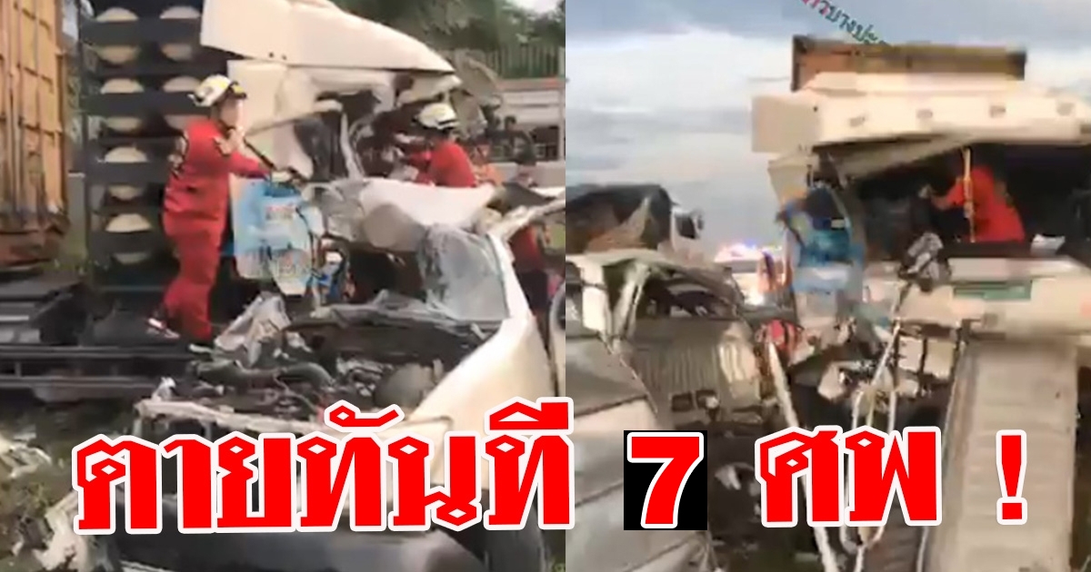 รถพ่วงพุ่งชนกระบะบรรทุกคนงานที่มอเตอร์เวย์ย่านบางปะกง ตายทันที 7 ศพ