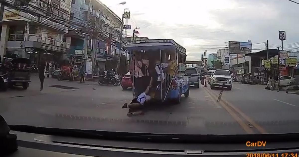 สองแถวออกตัวแรงเปลี่ยนเลน ทำนักเรียนหญิงตกรถ ไถลไปกับพื้นถนน (คลิป)