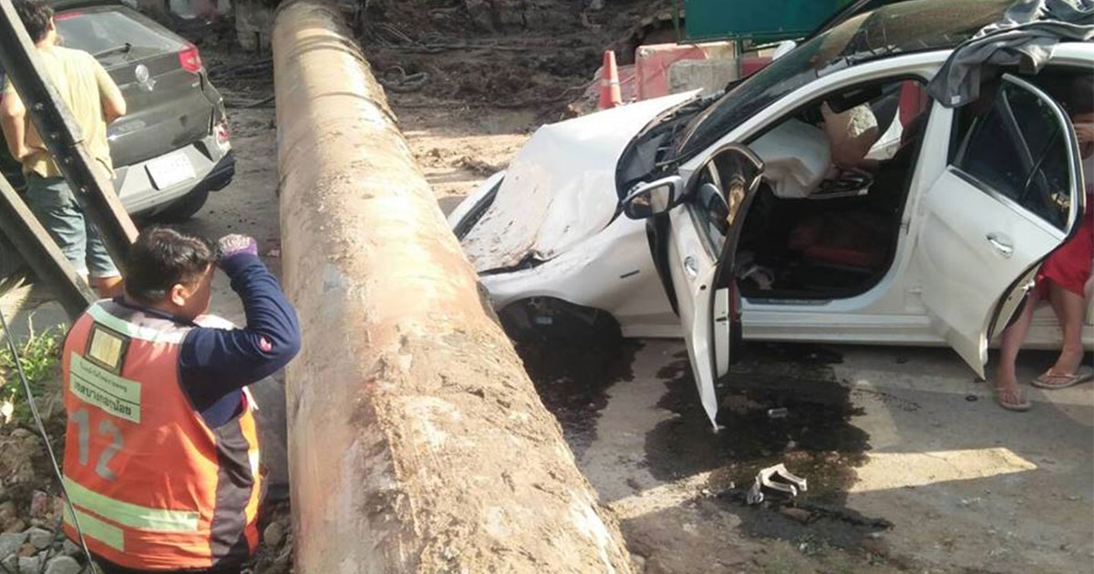 หวิดดับ แท่งเหล็กเจาะดิน ร่วงทับเก๋งพังยับ เจ้าของรถขวัญผวา