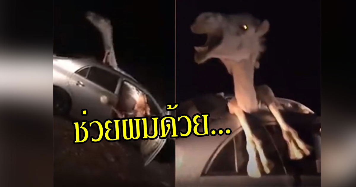 รถยนต์พุ่งชนอูฐเต็มแรง ตัวติดแหง็กออกไม่ได้ ดิ้นเอาชีวิตรอดสุดน่าสงสาร
