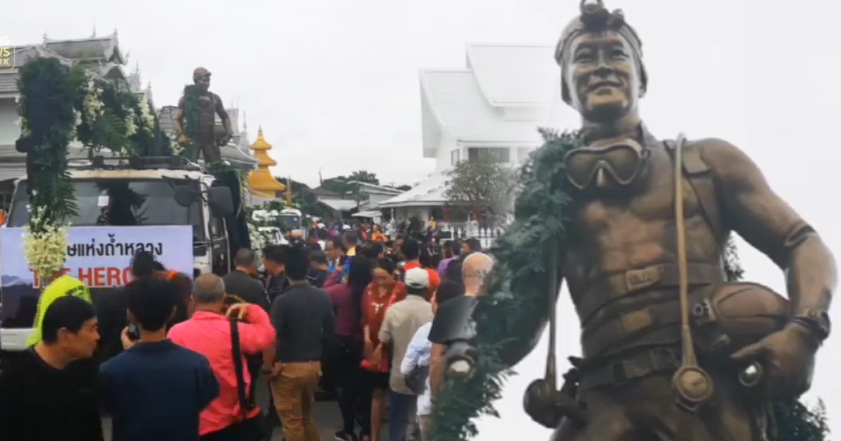 ฝนตกก็ไม่หวั่น อ.เฉลิมชัย พา 13 หมูป่า พร้อมประชาชน แห่รูปปั้นจ่าแซม มุ่งสู่ถ้ำหลวง