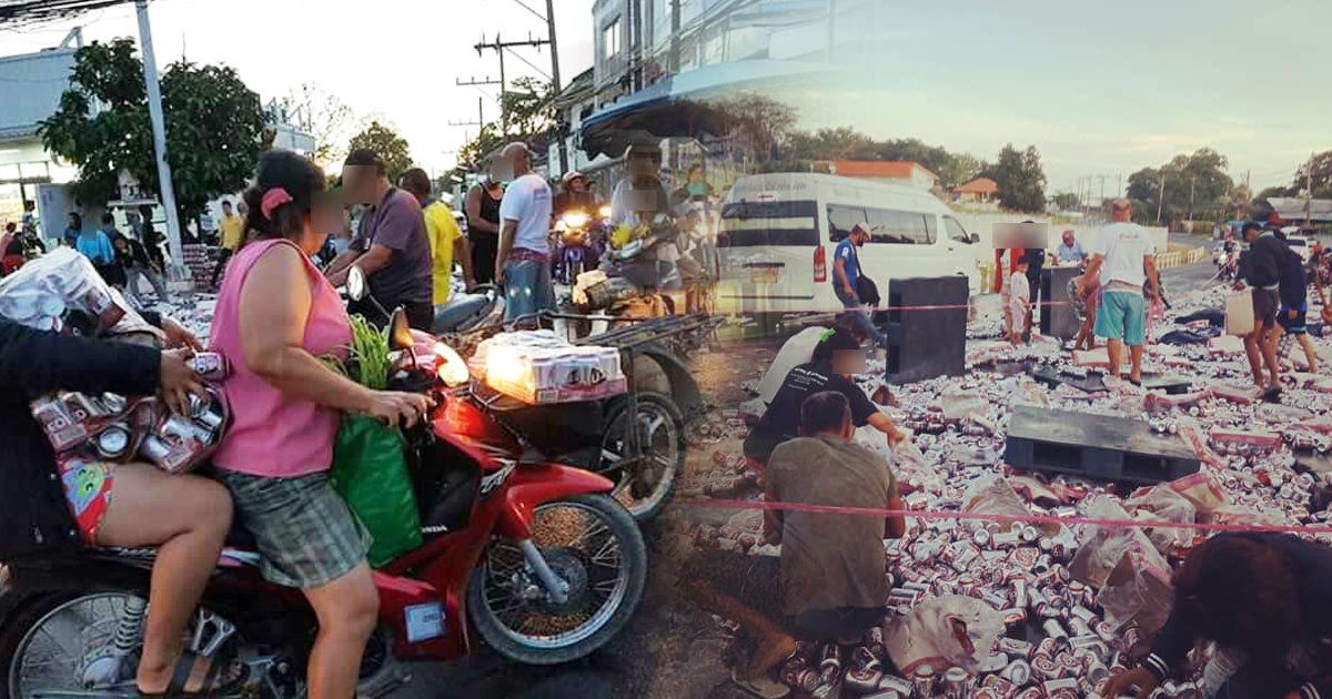 รถบรรทุกเบียร์คว่ำหน้าเซเว่นฯ ชาวบ้านแห่เก็บเบียร์กลับบ้าน ไม่ฟังมีคนเตือนผิด กม.