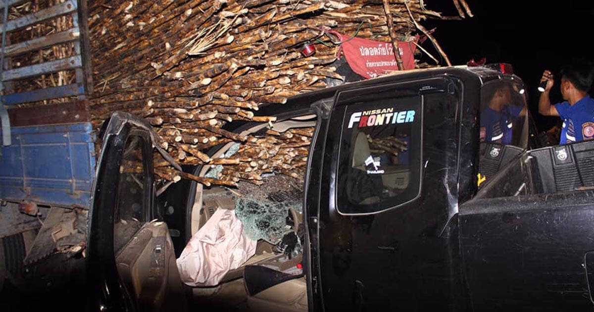 ชนสยอง ! กระบะพุ่งอัดท้ายรถบรรทุกอ้อย คนขับถูกลำอ้อยแทงหน้าดับ