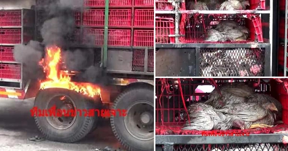 รถพ่วงบรรทุกไก่ เบรกติดไฟลุกไหม้ล้อ ย่างสดไก่เป็น ๆ ตายกว่า 200 ตัว