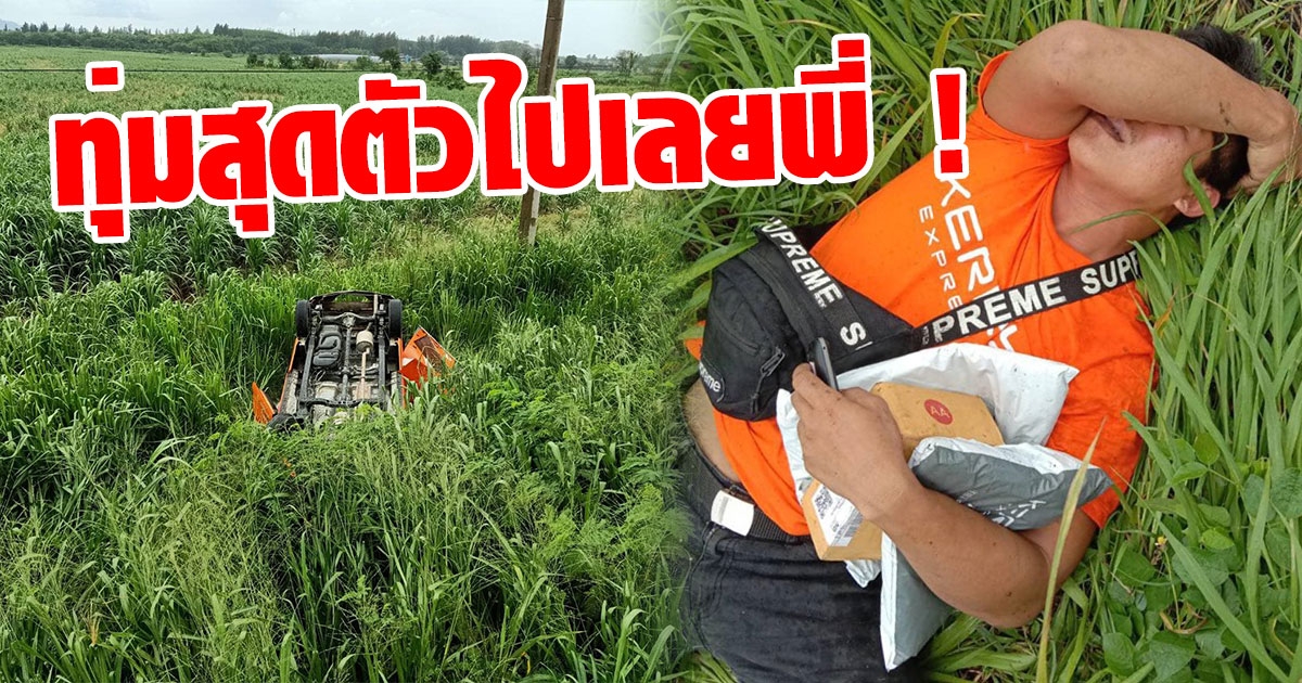 ฝนตกถนนลื่น ! หนุ่มเคอรี่ซิ่งรถคว่ำพุ่งลงป่า ตัวเจ็บ แต่มือยังกอดของลูกค้าแน่น