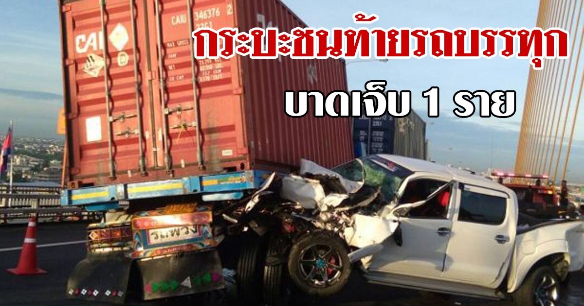 กระบะชนท้ายรถบรรทุก ก่อนโดนเสยท้าย รวม 3 คัน บนสะพานพระราม 9