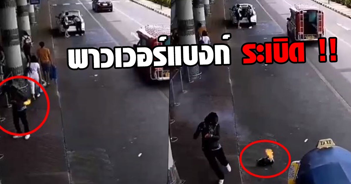 นาทีพาวเวอร์แบงก์ระเบิด ไฟลุกพรึ่บคาเป้สะพายหลัง ในสนามบินเชียงใหม่