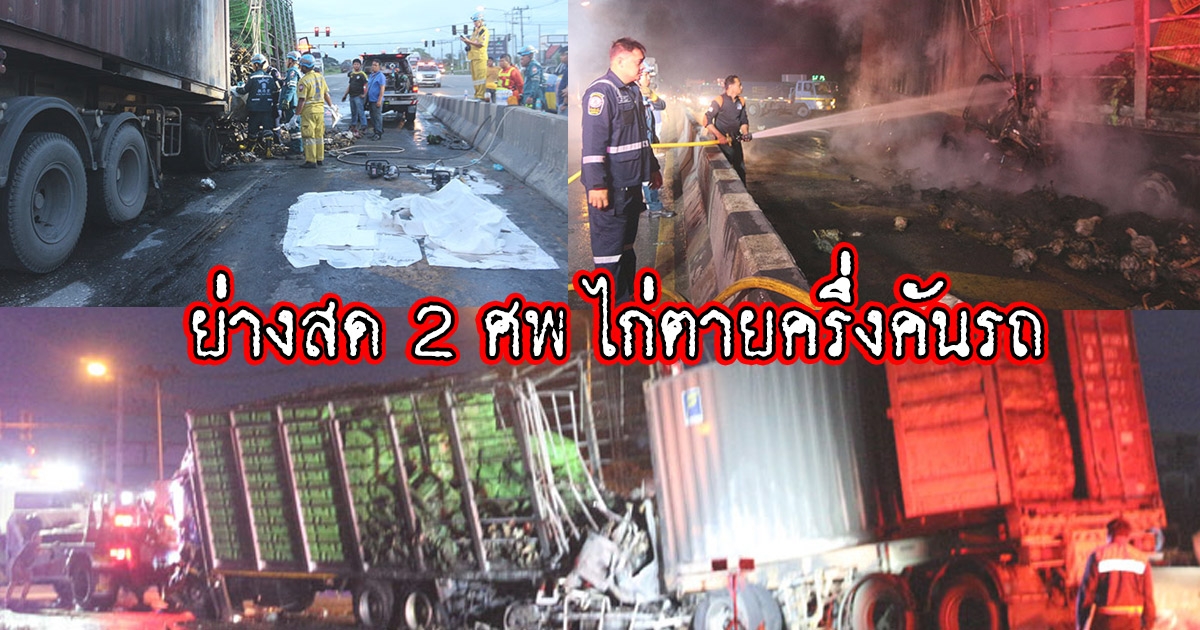 สุดสลด รถพ่วงเทรลเลอร์ ชนรถ 10 ล้อ 2 ศพโดนย่างคากองเพลิง จนระบุตัวไม่ได้