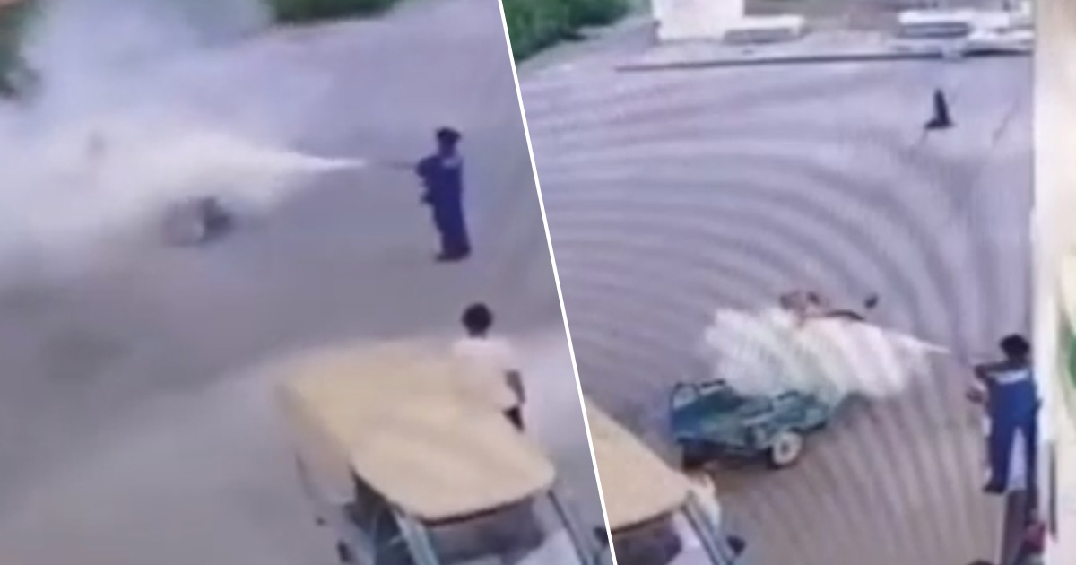 สิงห์อมควันเจอบทเรียน จุดบุหรี่สูบในปั๊ม สาวคว้าถังดับเพลิงไล่ตามฉีดรัว ๆ