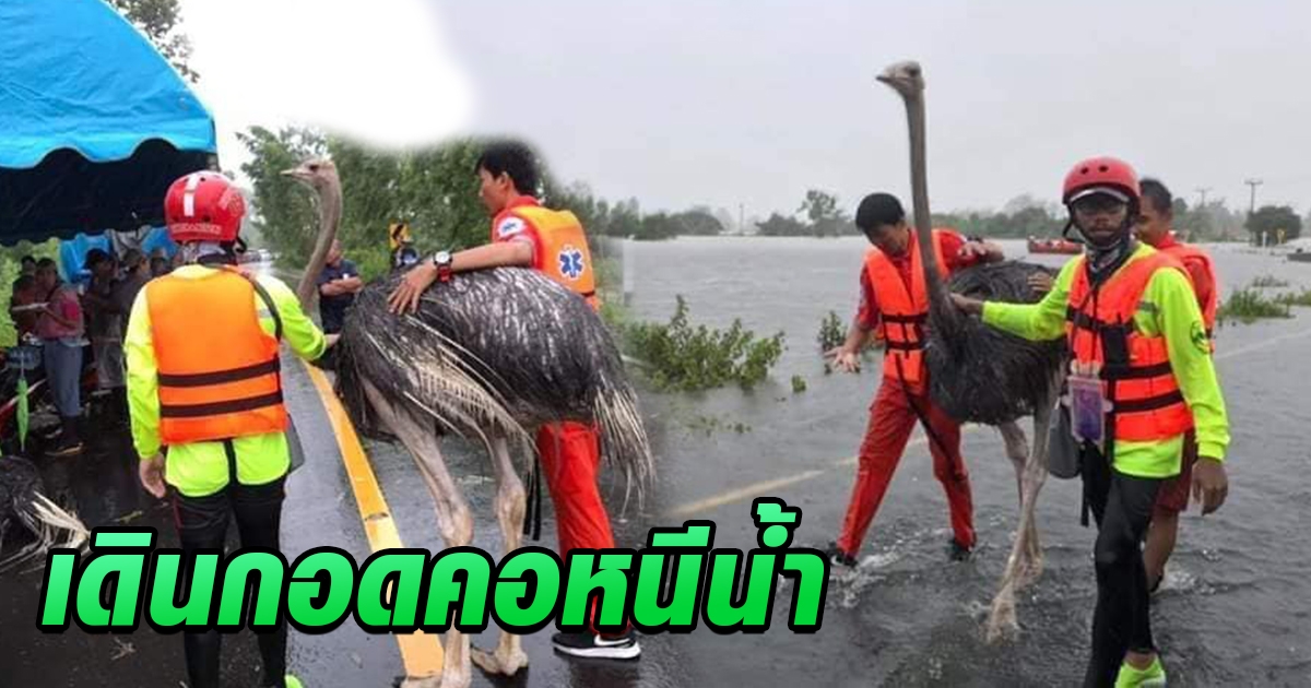 เจ้าหน้าที่กู้ภัยพานกกระจอกเทศ เดินลุยน้ำไปหลบยังที่ปลอดภัย