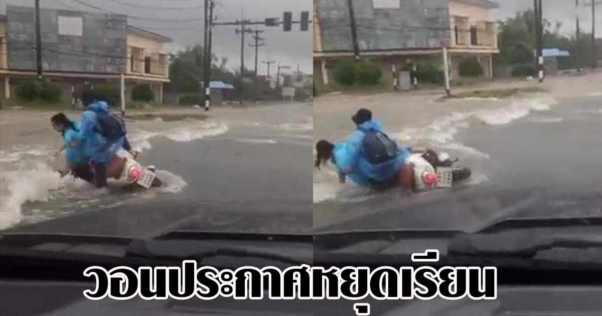 นักเรียนขี่ จยย. ลุยน้ำท่วมไป รร. รถคว่ำไม่เป็นท่า โซเชียลวอนประกาศหยุดเรียน