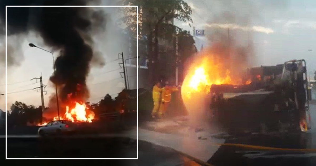 รถน้ำมันคว่ำ ไฟลุกกลางถนนนานนับชั่วโมง คนขับเผยนาทีชีวิต เปิดประตูไม่ออก