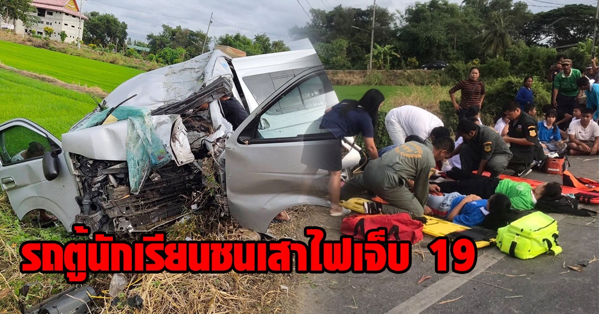 รถตู้อัดนักเรียนเต็มคัน 18 คน รถยางแตก พุ่งชนเสาไฟ เจ็บหนักร่างอัดติดซากรถ